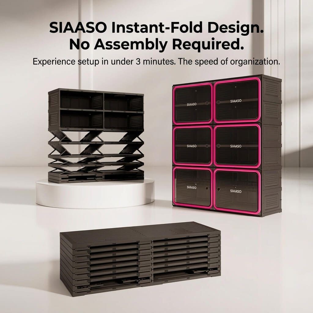 Just 3 minutes. Our patented one-piece folding design means you simply unfold it like an accordion, snap the doors in place, and it's ready. No tools, no screws, no frustration.