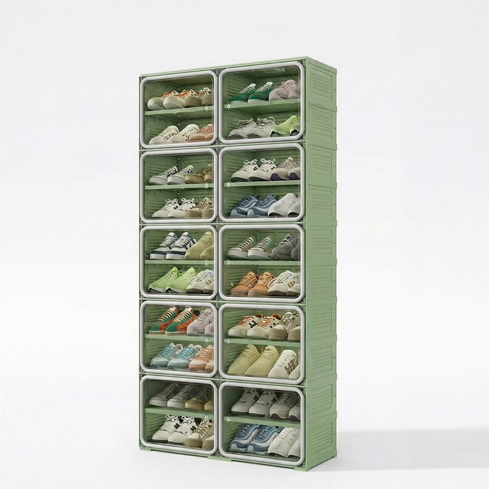 It is rock-solid. Despite being foldable, the integrated frame and secure snap-lock connectors ensure that even when stacked to 10 tiers, the cabinet remains stable. It is designed to hold heavy loads without leaning.